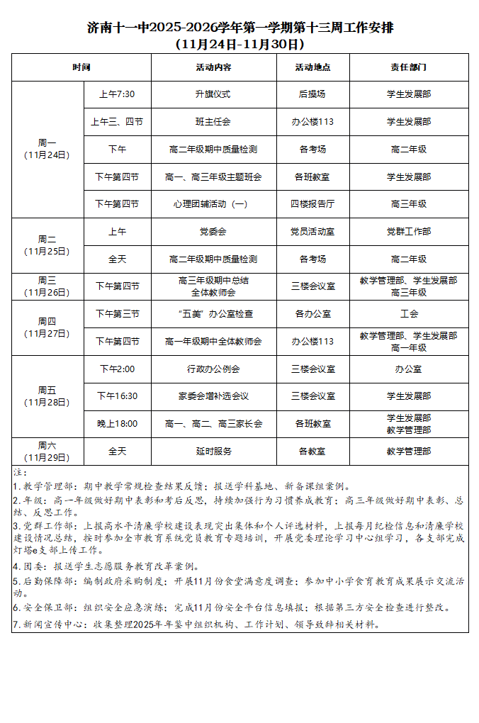 2025-2026学年第一学期第十三周工作安排(11月24日-11月30日)