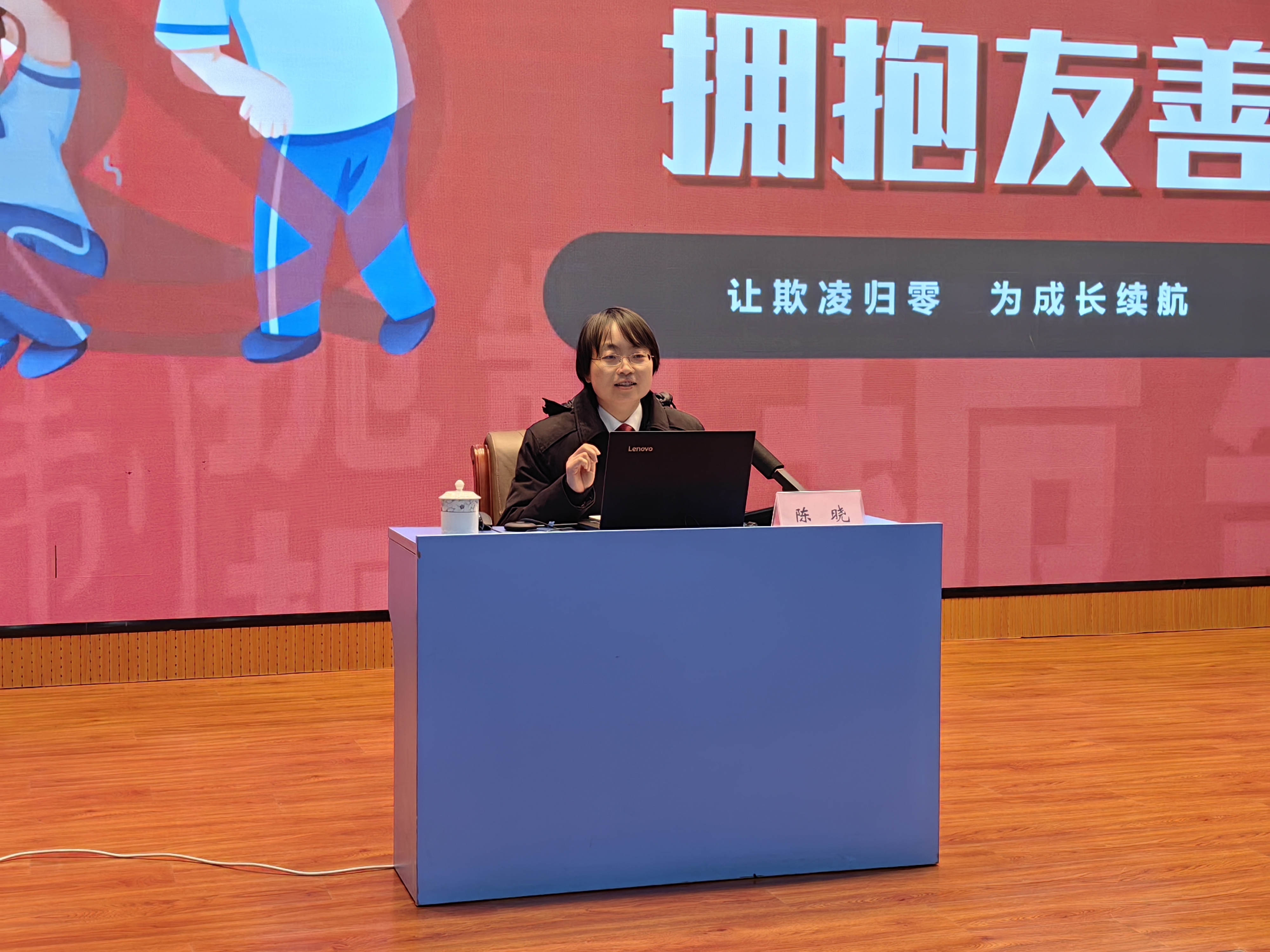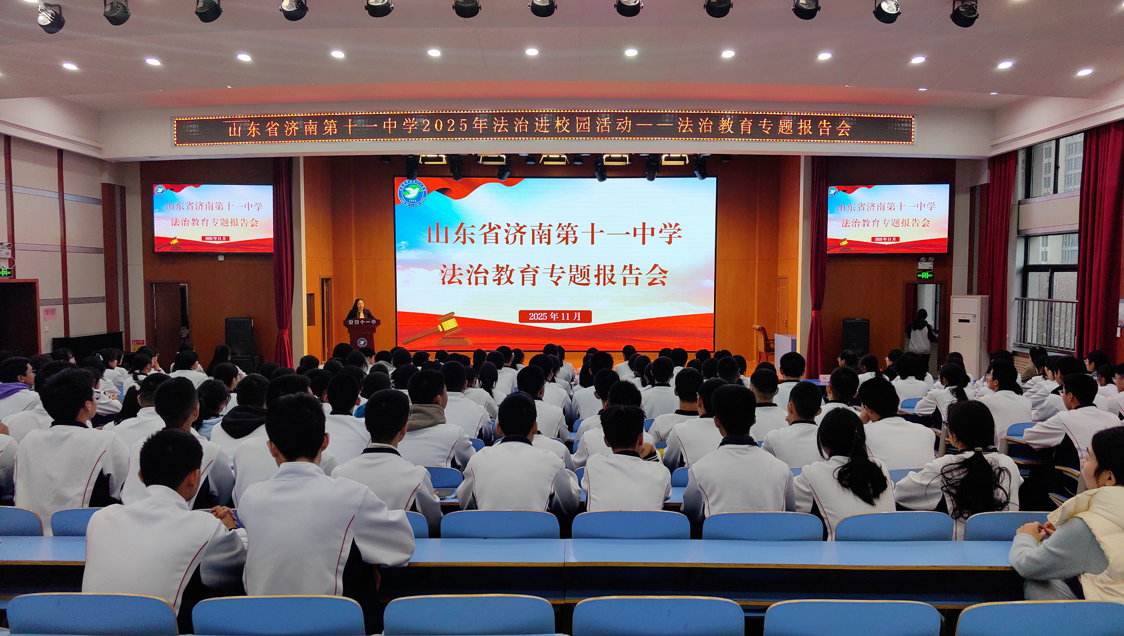 为切实增强学生法治观念,营造安全有序的校园环境,全面推进法治校园建设,11月17日下午,济南十一中开展法治教育专题报告会,学校法治副校长、济南市中级人民法院家事少年审判庭副庭长陈晓作“拒绝欺凌,拥抱友善”主题报告。 报告伊始,陈晓庭长用一则“灯谜”破冰,调动师生参与积极性。随后,她围绕“什么是学生欺凌”“欺凌有什么危害”“如何应对欺凌”三大板块,为同学们带来了一堂既专业又生动的法治报告会。陈庭长用四个关键词帮助同学们明确欺凌边界,并现场拆解“肢体欺凌、言语欺凌、社交欺凌、网络欺凌”四种常见欺凌类型。为让条文“活”起来,她选取近期三起行政处罚、刑事追责案例,对照民事赔偿、治安处罚、刑罚入罪的不同后果,让“年龄不是免罪牌”的观念直抵学生心底。
