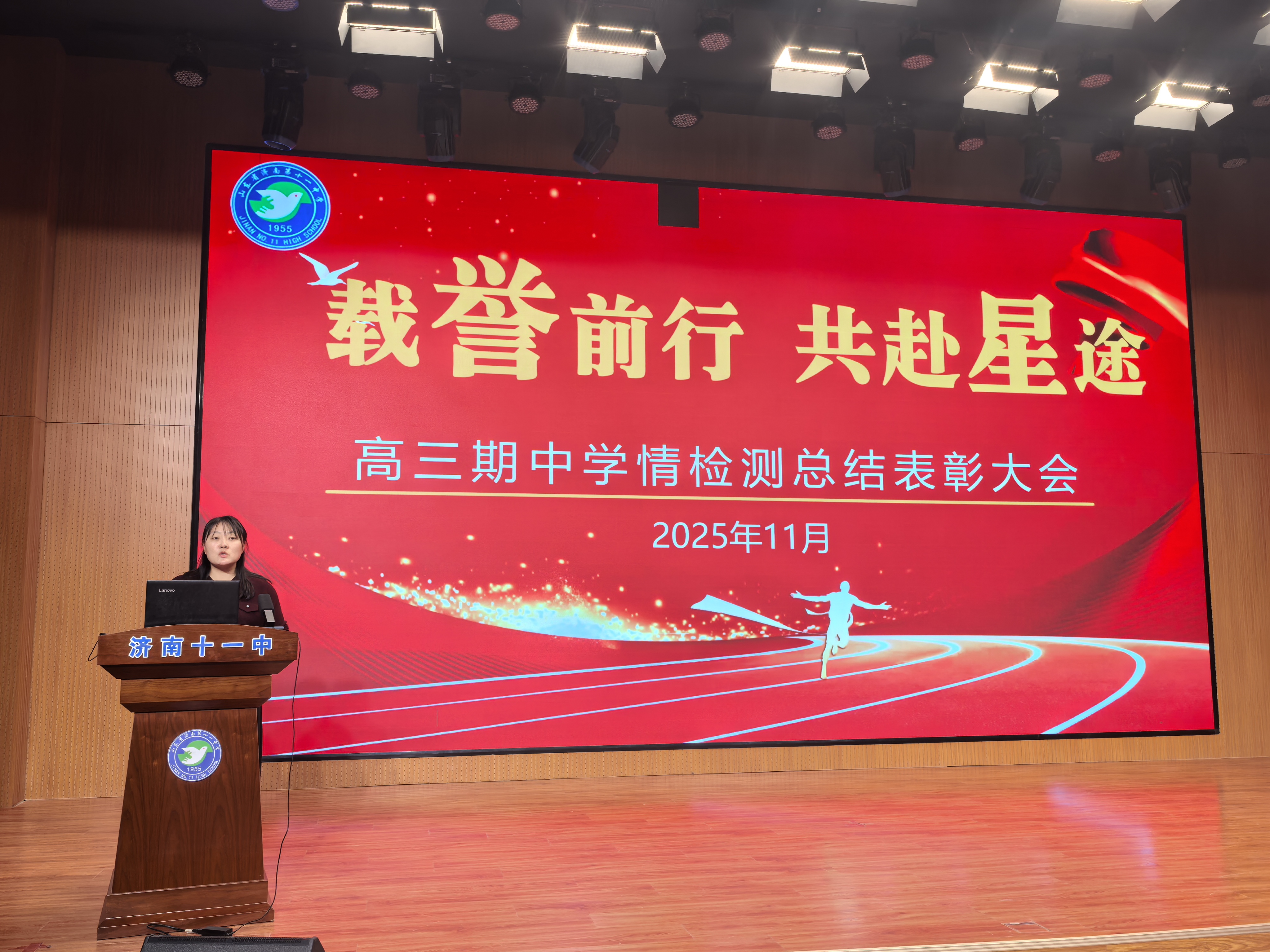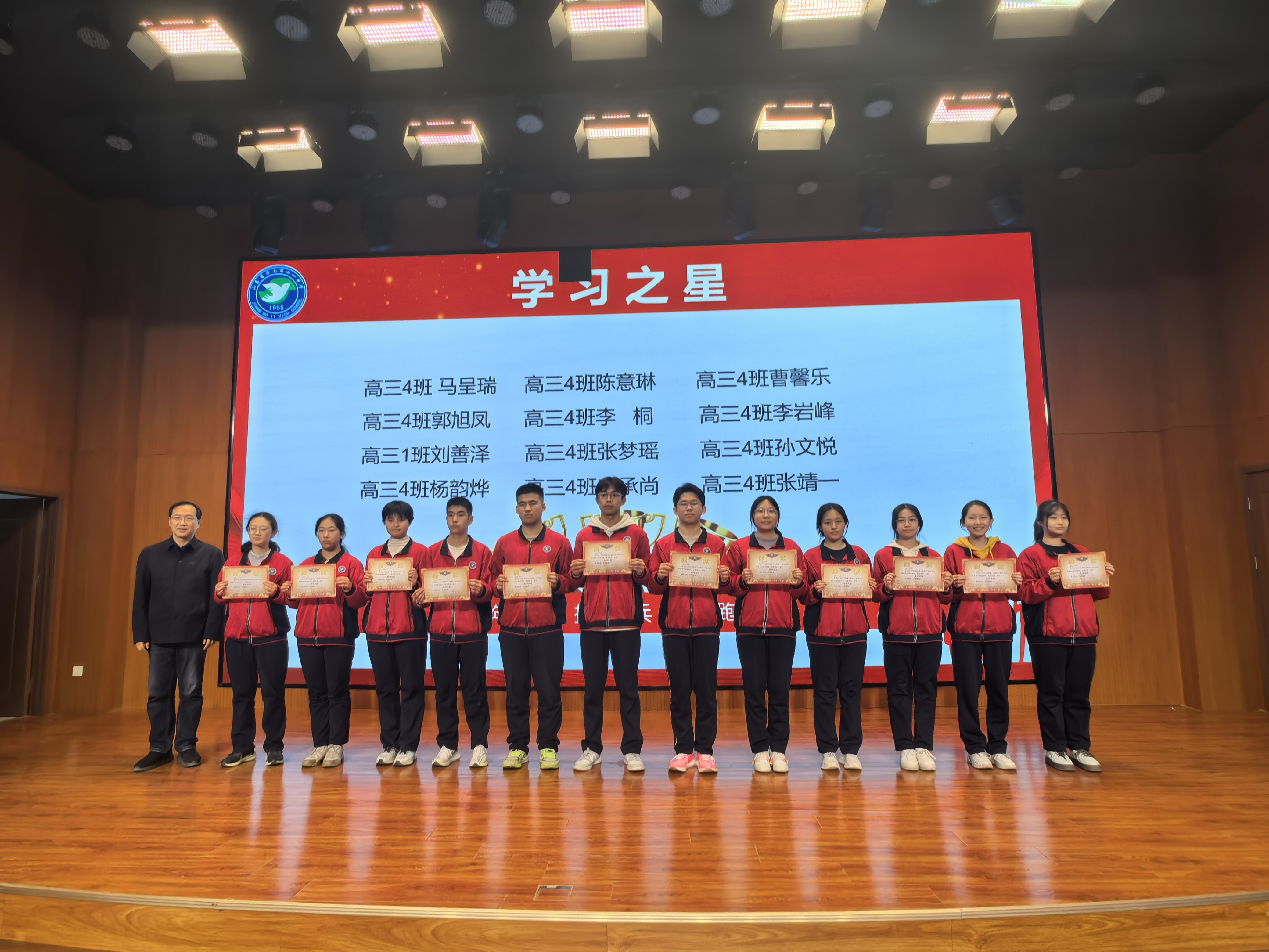 为复盘半程备考成效,表彰先进典型,缓解备考压力,凝聚冲刺合力,11月24日,高三年级期中检测总结表彰大会如期举行。全体高三师生齐聚现场,共忆拼搏时光、共话奋进之路,以昂扬姿态吹响后半程备考冲锋号。学校党委副书记、校长杨滨,副校长张清福、程令勇、张海龙,校长助理杜春泉,学生发展部主任杨莹参加了本次会议,会议由高三年级主任王芸主持。 大会伊始,王主任回顾了自高三开学以来,学子们三个月的奋斗历程——晨光中的诵读、课堂上的专注、深夜里的坚守,每一份付出都应被铭记,每一次拼搏都值得喝彩。此次大会既是对过往努力的复盘嘉奖,更是对未来征程的鼓劲扬帆。  表彰环节亮点纷呈。首先,副校长张清福宣读期中检测表彰决定,对在检测中表现突出的学子予以表彰,彰显了学校对勤奋拼搏、积极进取学子的肯定与期许。随后,颁奖仪式有序开展:校长杨滨,副校长程令勇、张海龙,校长助理杜春泉,学生发展部主任杨莹分别为五组“学习之星”颁奖,班主任代表邱丰秋、杨雁君、陈舒凡分别为“进步之星”“勤奋之星”“潜力之星”颁奖。一张张荣誉证书承载着汗水与荣光,一次次热烈掌声传递着认可与祝福。王芸主任寄语全体学子,希望获奖同学珍惜荣誉、戒骄戒躁、持续发力,未获奖同学不气馁、不松懈,找准差距、奋起直追,在接下来的备考路上绽放属于自己的光彩。