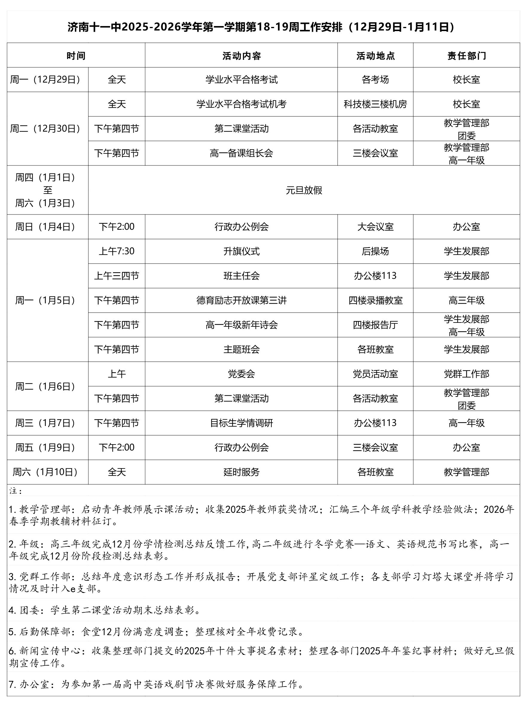 2025-2026学年第一学期第十八、十九周工作安排(12月29日-1月11日)