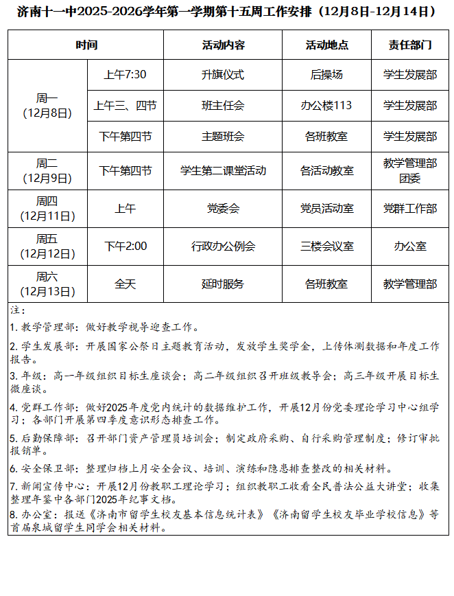 2025-2026学年第一学期第十五周工作安排(12月8日-12月14日)