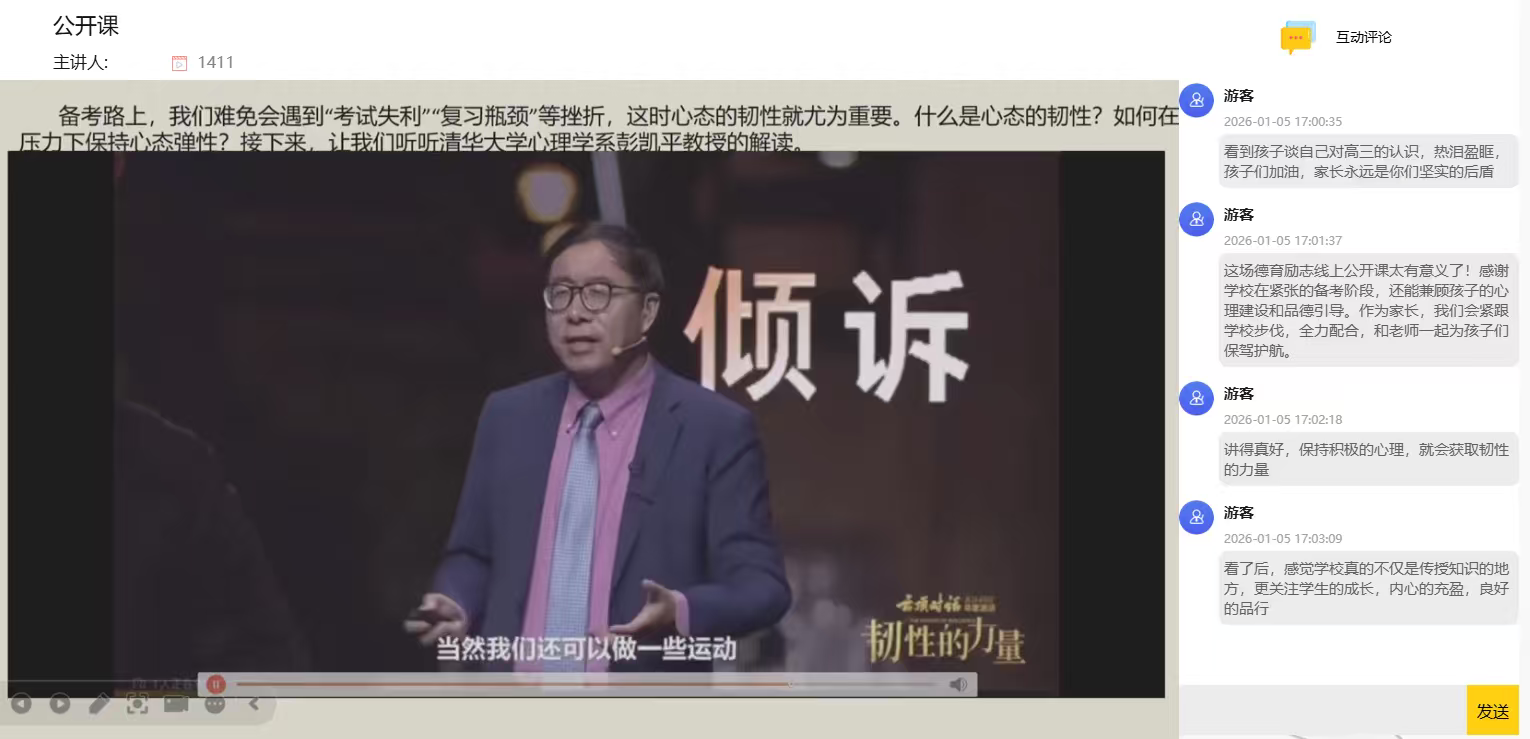 本次开放课不仅是一次励志教育,更是一场家校之间的深度对话。家长们透过屏幕,真切感受到孩子们在高三阶段的成长与努力,也对学校的育人理念和教师的用心付出表示高度认可。许多家长在互动区留言,表达对孩子的鼓励与对学校的感谢,凝聚起共同支持孩子、陪伴成长的强大合力。 高三之路,道阻且长;韧行致远,终见彩虹。我们相信,在家校协同、师生同心之下,每一位高三学子都能锁定目标、脚踏实地,在奋斗中绽放青春,在韧性中抵达远方。
