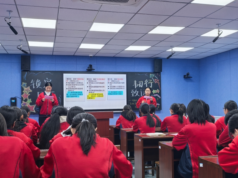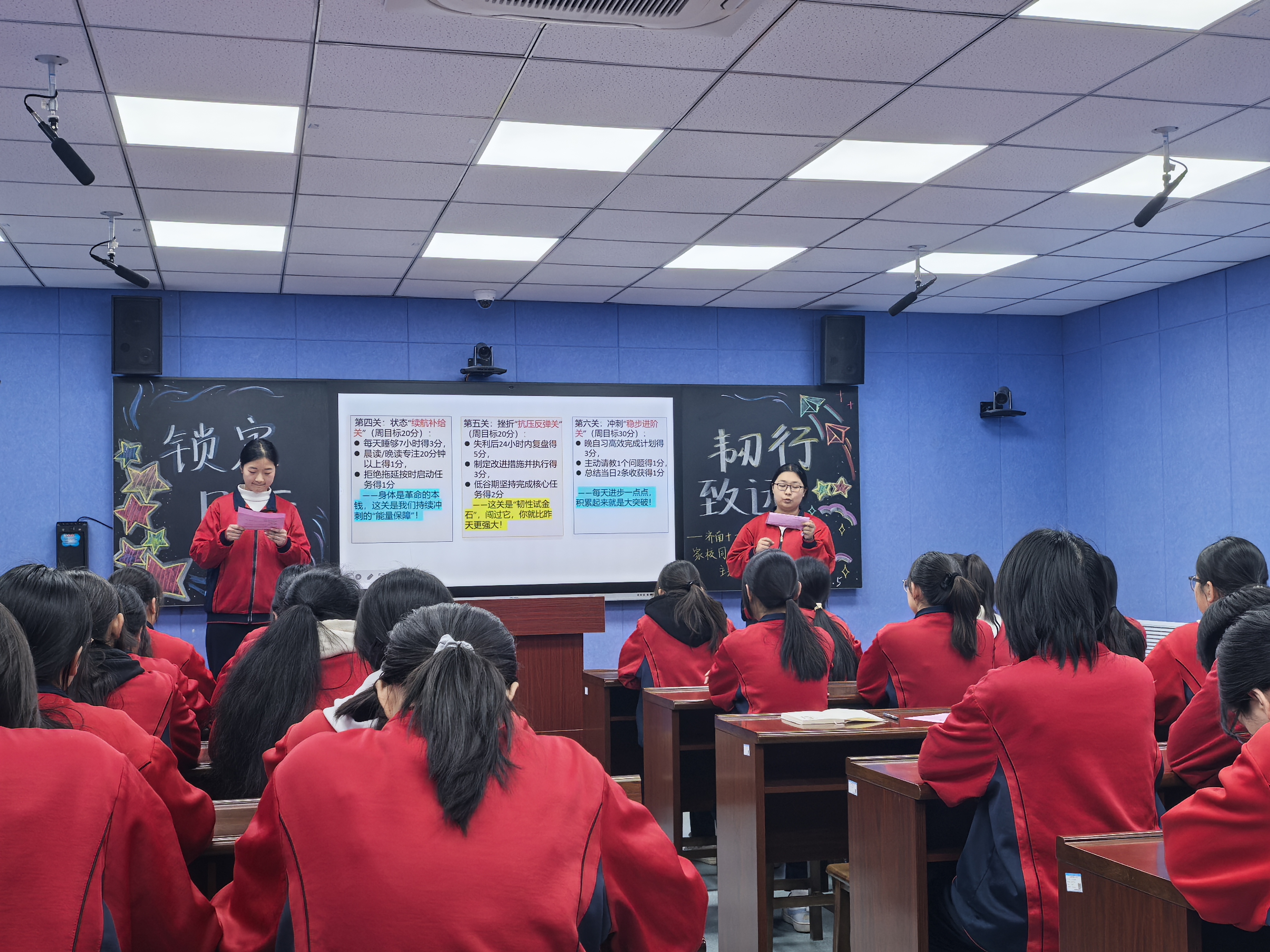 班会主体围绕“目标笃定”“科学规划”“韧行致远”三大板块展开。通过引用哈佛大学关于目标与成就的研究数据,引导学生明确清晰目标对人生发展的重要导向作用,鼓励学生做自己命运的主宰,在高三阶段扎根成长、淬炼成金。针对部分学生可能出现的“空心病”“拖延症”“假学习”等现象,班会提出了具体而警醒的应对策略,强调内在动力的激发与行动力的提升,推动学生从“想”到“做”,从“被动”到“主动”。 在“韧行致远”环节,班会聚焦备考中的心态调整与韧性培养。通过观看清华大学彭凯平教授《韧性的力量》专题视频,学生与家长共同学习了在压力下保持心理弹性的方法。随后,班会发布了独具特色的“韧性攻坚计划”,将学习过程转化为六大闯关任务,涵盖课堂专注、限时训练、错题整理、作息管理、挫折应对、每日进阶等方面,以积分形式激励学生持续行动、日积月累,在闯关中锤炼韧性、在坚持中实现突破。 活动最后,全体学生起立齐诵励志宣言:“我的人生没有失败,要么成功,要么成长……”铿锵有力的声音回荡在云端教室,也激荡在每一位参与者心中。学生们挥舞手中的“韧性计划卡片”,为自己加油鼓劲,展现出迎难而上、奋发向前的精神风貌。