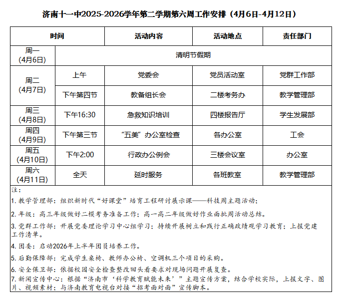2025-2026学年第二学期第六周工作安排(4月6日-4月12日)
