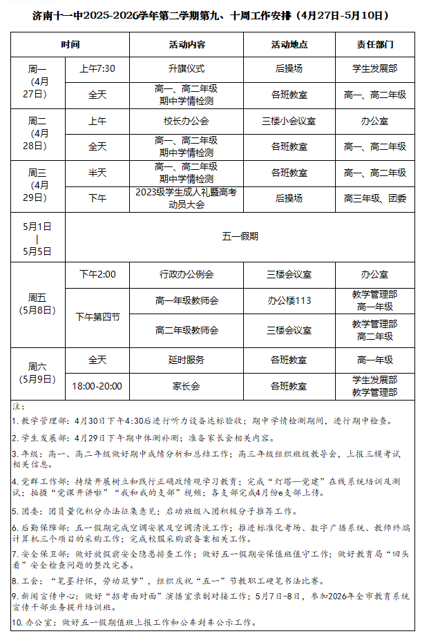 2025-2026学年第二学期第九、十周工作安排(4月27日-5月10日)