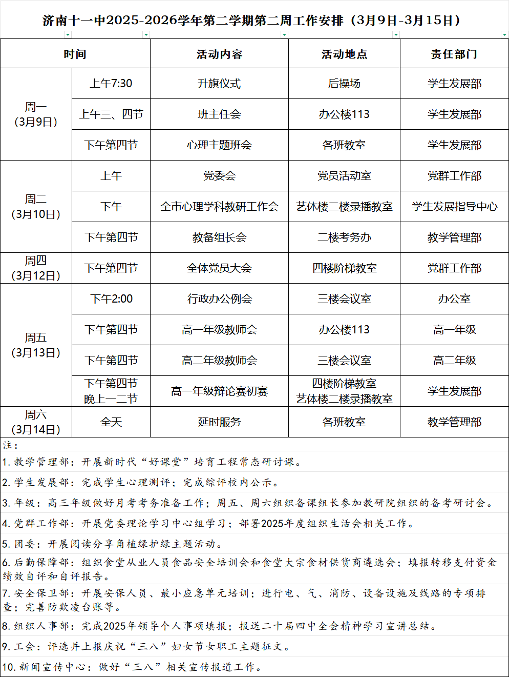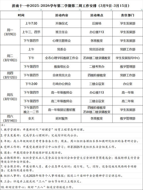 济南十一中2025-2026学年第二学期第二周工作安排(3月9日-3月15日)