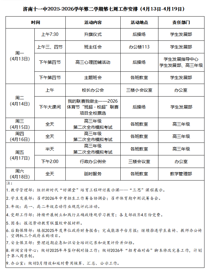 2025-2026学年第二学期第七周工作安排(4月13日-4月19日)