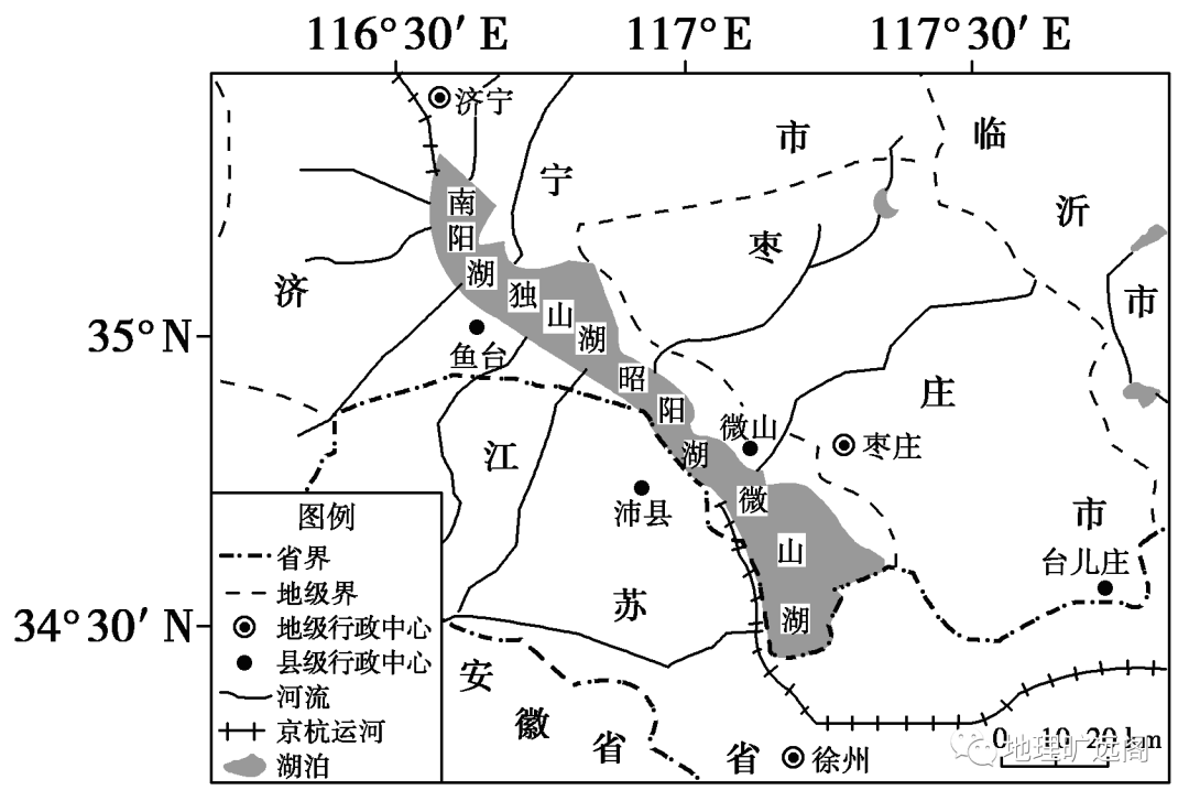 1、(2015广东文综)山东省南部的南四湖,由微山湖、昭阳湖、独山湖、南阳湖组成,是南水北调东线工程的重要通道,沿湖地区工业以煤炭、电力、造纸为主。根据材料,结合所学知识,完成下列问题。