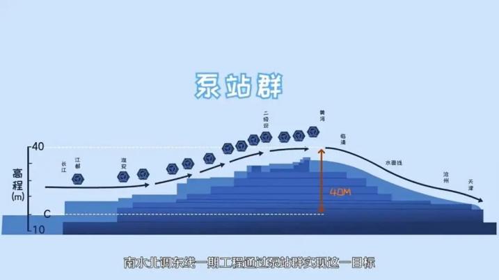 材料二:南水北调工程东线工程海拔走势图和东线泵站群。
