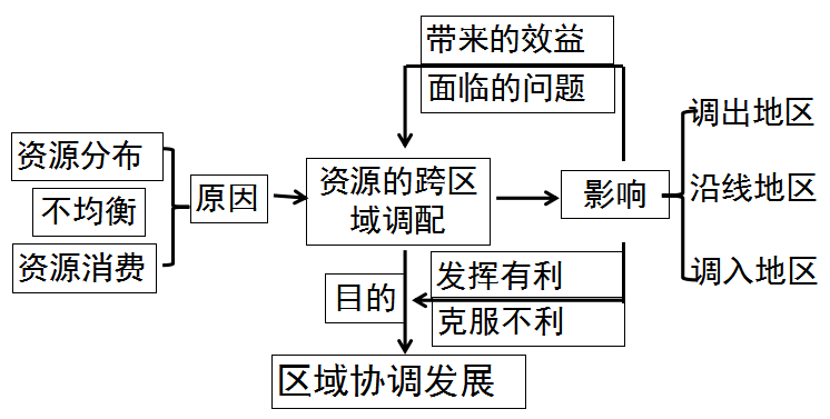 本考点一般有两种考法:一是以某资源跨区域调配的图文材料为切入点,考察该资源跨区域调配工程建设的地理背景、线路的优缺点;二是考察对区域发展的影响,要从输入地、输出地、沿线地区综合分析有利和不利影响。